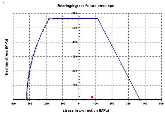 Failure envelopes covering all possible failure modes of a bolted joint, i.e., tension, cleavage, shear and bearing have the typical form of Figure 7. Such failure envelopes are constructed by experimentally testing different geometrical configurations of bolted joints with different material types and lay-ups. The bearing bypass failure envelope, which corresponds to the geometry, material system and lamination of the joint as defined in each iteration, is examined in order to examine if the applied bearing bypass load combination (indicated by the red dot plotted in Figure 7) falls within the respective failure envelope. Apparently, when the bearing bypass load combination falls inside the envelope, no joint failure is expected, while when the dot lies outside the failure envelope a failure is predicted, thus another re-sizing iteration should be performed.