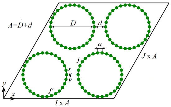 Geometry of the computational cell with nanotubes ( in this case, while , in simulations). Each zigzag CNT is represented by 30 carbon atoms that move on the plane. Each atom stands for a row of atoms oriented normal to the plane, which moves as a rigid body. Geometry parameters are as follows: a is the distance between carbon atoms in the CNT wall, d is the distance between the walls of neighboring CNTs, D is CNT diameter and is the distance between centers of neighboring CNTs. The computational cell in the form of a parallelogram has the sides and . The computational cell is subject to the periodic boundary conditions. Indices p, q, s, f, and are used to describe the interatomic interactions.