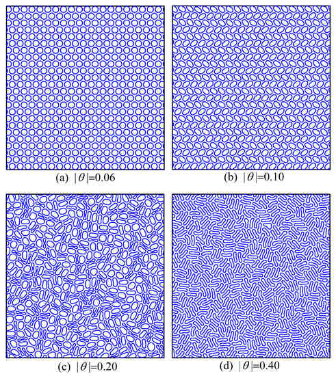 During step-wise biaxial compression the structure of CNT bundle exhibits several qualitative transformations (the results for the small volumetric strain can be found in [70]). In Figure 2a–d, structures are shown for , 0.10, 0.20 and 0.40, respectively. In (a) CNTs still preserve their nearly circular cross sections, while in (b) one can see periodic structure of CNTs having elliptic cross sections. In contrast to the structure in (a), the structure in (b) has translational cell with two CNTs, which is formed as the result of second-order phase transition [70]. For the compressive volumetric strain of , as shown in (c), collapsed CNTs appear in the structure as the result of the first-order phase transition. Further compression results in the increase of the collapsed CNT fraction and at all CNTs are collapsed, as it can be seen in (d).