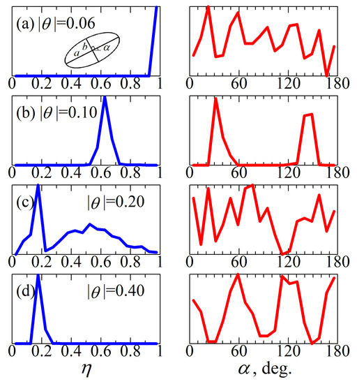 Parameters and are calculated for each CNT and then the 20-bin histograms are constructed. In Figure 3a–d, the histograms are shown for at left and for at right for , 0.10, 0.20 and 0.40, respectively. From this figure one can see that at all CNTs have and various orientation angles. CNTs in Figure 2a, being under biaxial compression, have slightly flattened faces with the cross section resembling hexagonal prisms. The expected long diameters of the prisms have orientations of 30, 90 and 150 degrees. However this effect is very weak and the cross section profiles are perturbed by the discreteness of the CNT walls and we see other peaks in Figure 3a, right panel. For nearly cylindrical CNTs the orientation angles mainly reflect the presence of the computational noise. In (b) one can see a drastic change of the histograms. Here all CNTs have and orientations about 30 and 150 degrees (see Figure 2b). In (c) the histogram for has a sharp peak at and a broad hump centered at . The sharp peak stands for the collapsed CNTs and the hump represents the non-collapsed CNTs with various ellipticity. The orientation angle histogram in (c) does not reveal preferable orientation angles (see Figure 2c). In (d), the broad hump disappears in the distribution of since all CNTs collapse (see Figure 2d). On the other hand, the histogram of orientation angles in (d) features three distinct peaks at 0, 60 and 120 degrees.