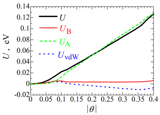 In Figure 4, as the functions of the volumetric compressive strain, we plot the potential energy of the relaxed CNT bundle, U, and its three components: the energy of valence bonds , valence angles , and van der Waals interactions , see Equation (1).