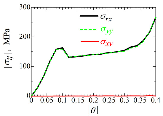 We also note that during the whole studied range of compressive strain the equality of normal stress components nearly holds, , and shear stress remains nearly zero, , as it should be for biaxial compression. This means that the considered computational cell size is sufficiently large.