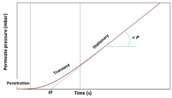 Transport of gases in dense membranes is described by the so-called solution-diffusion model [20,21]. One of the most commonly used techniques for the determination of the permeability of dense membranes is the so-called time lag method [20,21,22], in which a membrane is fixed in a permeation cell with two separate compartments (feed and permeate). After complete evacuation of the membrane for a sufficiently long time, it is suddenly exposed to the gas of interest, from the feed side of the membrane cell, after which the pressure is recorded in the permeate side with constant volume. A typical curve can be divided into three distinct regions (Figure 1): in the penetration region, the gas is absorbed at the feed side of the membrane and it starts diffusing across the thickness of the film, but it does not reach the permeate side; in the transient region, the first gas molecules start desorbing from the membrane at the permeate side, and the rate gradually increases until it becomes constant. These two phases are related to the diffusion coefficient, D. Finally, in the stationary state, which is used to determine the permeability coefficient, P, a constant flux across the membrane takes place. If Fickian diffusion takes place, and the solubility of the gas and its diffusion coefficient in the polymer are both constant, then the diffusion coefficient can be determined from the membrane thickness, l, and the time lag, Θ, which is the intersection of the tangent to the steady-state permeation curve and the horizontal axis (Figure 1), allowing the determination of the diffusion coefficient as follows: