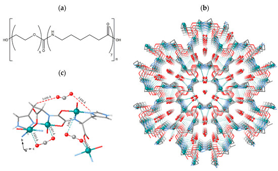 (a) Pebax®1657 molecular structure and (b) perspective views of the porous structures of {Cu2[(S,S)-hismox]}·3CO2 determined by single-crystal X-ray diffraction containing CO2 [36]. (c) Building block of {Cu2[(S,S)-hismox]} showing in more detail the coordination of CO2.