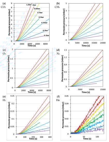 The Pebax®1657/CuII2(S,S)-hismox mixed matrix membrane had a thickness of 150 µm, which is thick enough to get a time lag of several hundreds of seconds for the slowest gas species, yet not too thick to get a low signal-to-noise ratio. Figure 3 shows an example of the time lag curves for the membrane with Pebax®1657/CuII2(S,S)-hismox mixed matrix membrane in the constant volume/pressure increase instrument, at feed pressures ranging from 0.1 to 1.2 bar. Qualitatively, it is clear that small and rapidly diffusing gases such as He and H2 show a quick increase in the permeate pressure, and a constant permeation rate is reached within some tens of seconds to not more than 100 s.