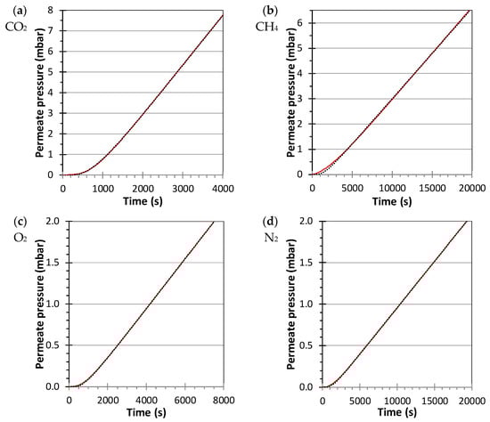 Permeation curve in the Pebax®1657/CuII2(S,S)-hismox·MMM (mixed matrix membrane) at 1.2 bar and 25 °C for (a) CO2; (b) CH4; (c) O2; (d) N2; and their fits in dotted black lines using Equation (4).