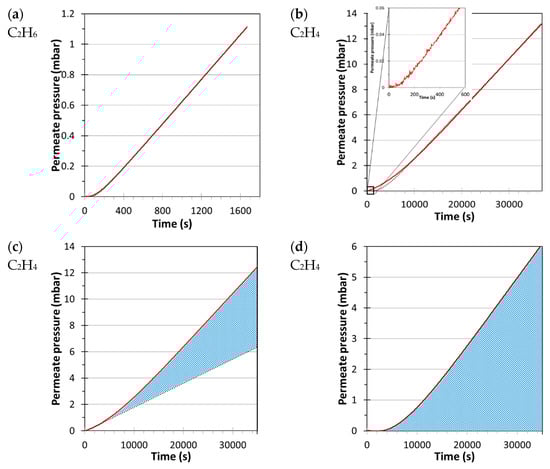 Permeation curve in the Pebax®1657/CuII2(S,S)-hismox MMM at 1 bar for C2H6 (a) and C2H4 (b) and their fits using Equation (4). Alternative two-stage fit of the permeation curve of C2H4 with the first stage (c) and second stage (d) fits using Equation (8). The shaded area denotes the residuals of the fit of the start of the permeation curve and can be fitted as a typical time lag curve in the second stage.