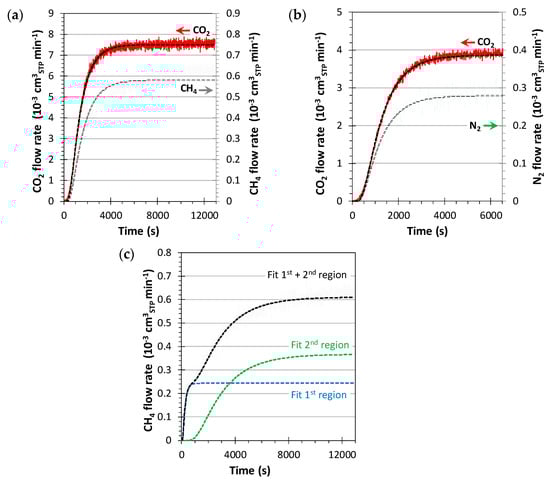 Permeate flow rate in the variable volume/constant pressure instrument for MMMs based on Pebax®1657/CuII2(S,S)-hismox·using (a) the binary mixture CO2/CH4 (35/65 v/v) and (b) the binary mixture CO2/N2 (15/85 v/v) with the N2 signal displayed as the 5-point moving average for noise reduction. Fits are reported in dotted black lines and are calculated on the rough data using Equation (9). (c) Two-step fit CH4 permeation curve. Figure adapted from [36].