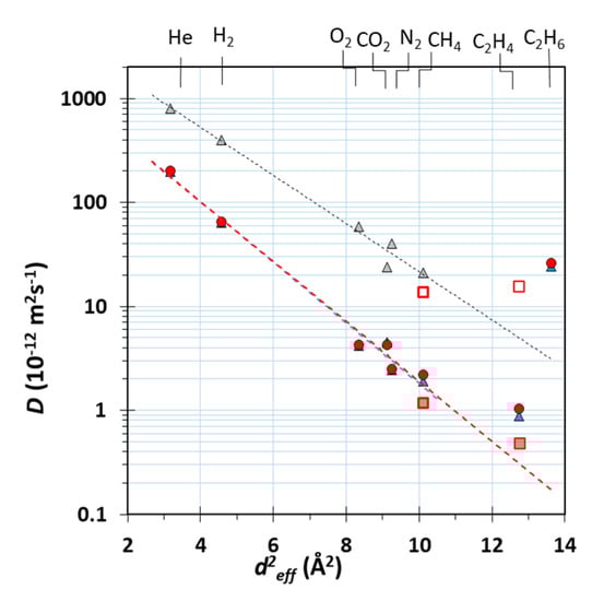 Correlation of the effective diffusion coefficient as a function of the molecular diameter of H2, He, N2, O2, CH4, CO2, C2H4, and C2H6 for neat Pebax®1657 (grey triangle,
