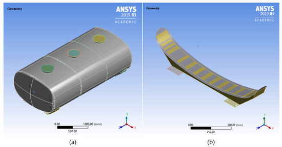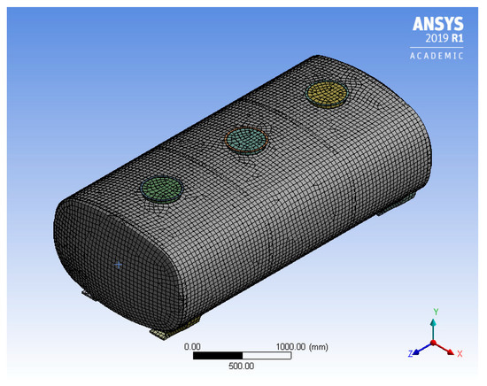 The mesh in both FE models was identical and it is presented in Figure 3. The mesh consisted of SHELL181 surface FE and CONTA174 and TARGE170 surface contact FE. The criterion for meshing was uniformity and, after a convergence study, the maximum edge length of 50 mm was selected. SHELL181 is a FE suitable to model thin to moderately thick shell structures, such as pressure vessels and tanks [28,29]. SHELL181 consists of 4-nodes with six degrees of freedom at each node, three translational and three rotational ones, and it employs a five-point integration rule. The CONTA and TARGE elements were used to simulate the weldments between the parts of the tank, i.e., the shells to the ends, the shells to the partition, the shells to the supports, and the supports to the mounting plates. Both FE models consisted of 13,915 FE and 14,474 nodes. The average element quality of the mesh was 0.93. The metric of the element quality, for shell elements, is based on the ratio of the area of the elements to the sum of the square of the edge lengths and the value of 1.00 denotes a perfect square or an equilateral triangle.