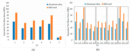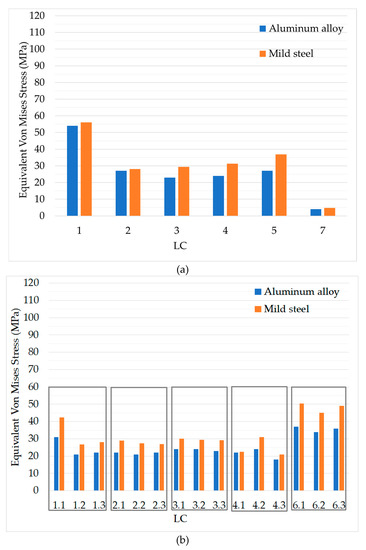 Maximum values of equivalent von Mises stress (SEQV) for both construction materials for (a) LC1–LC5 and LC7 and (b) LC1–LC4 and LC6.
