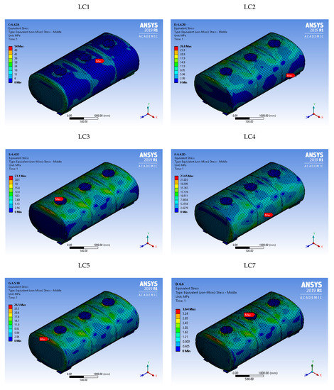 The SEQV contours did not depend on the material. For this reason, in Figure 5 the SEQV contours for LC1–5 and LC7 considering the total payload of the tank are presented for the FE using aluminum alloy as construction material.