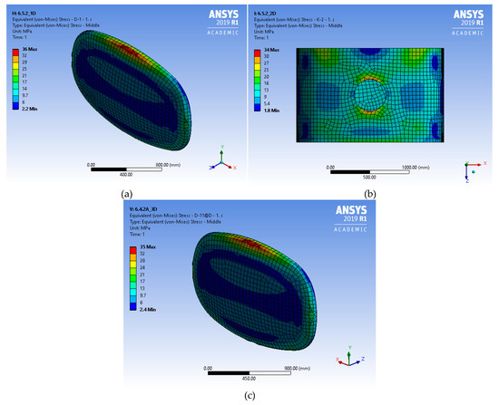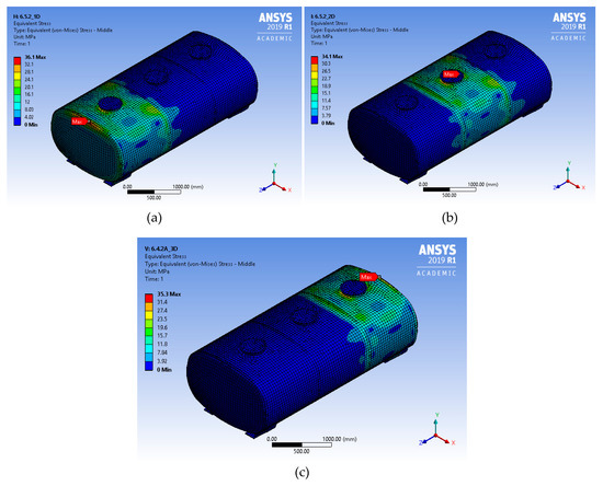 According to both the aforementioned Standards, a value for the minimum shell thickness for the tanks with respect to their construction material is provided, along with conditions to further reduce this thickness. An overall minimum thickness value is also provided per material [25,26]. Four different methods for the verification of the design of such a tank are reported in Annex A of the EN13094:2015, namely the (1) dynamic testing, (2) finite element stress analysis, (3) reference design, and (4) calculation method, or a combination of them. In order to perform the dynamic test and use the reference design, the tank needs to be constructed, while the finite stress analysis and the calculation method can be performed right after the preliminary design of the tank, prior to its construction, leaving space for the construction of an optimized design [15]. For the proposed finite element stress analysis and the calculation method, the shell thickness provided by the Standards is considered and the stress values on the shell, the ends, the partitions, and the support of the tank are monitored and compared to the design stress as it is defined in EN13094:2015. Along with these stresses, also the stresses developed on the weldment areas can be monitored and compared to the weldment strength, as it is defined in the EN13094:2015 through the weldment efficiency factor.
