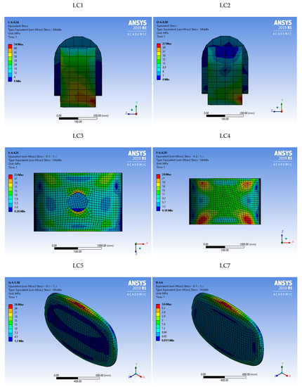 Detailed SEQV plots for the highest stressed component are provided for LC1–5 and LC7 in Figure 7 for the FE model using aluminum alloy as construction material. The area with the red color is the area of highest SEQV value.