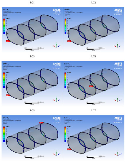 Detailed frictional stress contours of the highest stressed weldments for LC1–5 and LC7.
