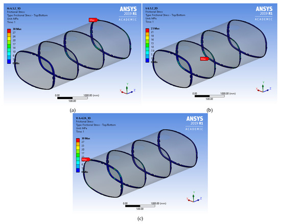 Detailed frictional stress contours for LC6 per compartment (a) 1, (b) 2, and (c) 3.