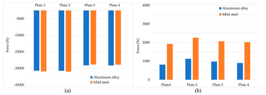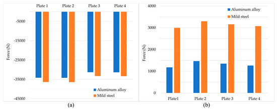In Figure 11 the values of the reaction forces per plate and force direction, according to the global coordinate system for both FE models, are presented for two LCs. Plates 1 and 2 are welded on the front support while plates 3 and 4 are welded on the rear support.
