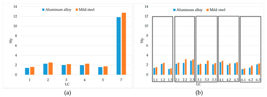 Safety factor with respect to yield stress for all LCs considering full tank using (a) aluminum alloy (3.0 mm) and (b) mild steel (2.0 mm) as construction material.
