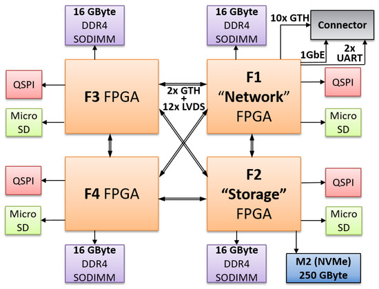 The compute-node board includes 4 Xilinx Zynq Ultrascale+ MPSoC devices (ZCU9EG), each featuring 4x(ARM-A53) and 2x(ARM-R5) cores, along with a rich set of hard IPs and Reconfigurable Logic. Each Zynq device has a 16 GB DDR4 (SODIMM) attached and a 32 MB Flash (QSPI) memory. Also, as shown in Figure 1, within the QFDB each FPGA is connected to each other through 2 HSSL and 24 LVDS pairs (12 in each direction). Out of the four, only the “Network” FPGA is directly connected to the outside world, while the “Storage” FPGA has an additional 250 GB M.2 SSD attached to it. The maximum sustained power of the board is 120 Watts, while the power dissipation during normal operation is usually around to 50 Watts. Targeting a compact design, the dimension of the board is 120–130 mm while no component on top or below the printed circuit board (PCB) is taller than 10 mm.