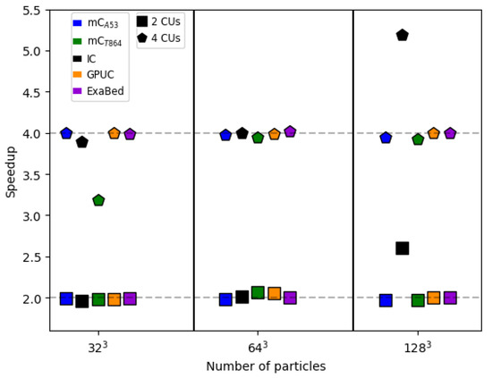As expected, for almost all types of CUs, a linear speedup time execution reduction is achieved. We observe a speedup time execution reduction using 4 CUs for particles only in the case of the mC. For the IC, on the contrary, a super linear speedup time execution is achieved using 2 and 4 CUs for particles.