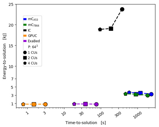 Not surprisingly, both GPUC and ExaBed achieve the solution with less energy () than either IC or mC. The most interesting thing to point out is the equivalence of the energy-to-solution between GPUC and ExaBed, which indicates a definite trend toward Exascale prototype. We can also see the effect of the energy consumption overhead when a node uses only a subset of its cores or sockets. This effect is evident for IC when using 1 or 2 CUs (a subset of all the CUs available).