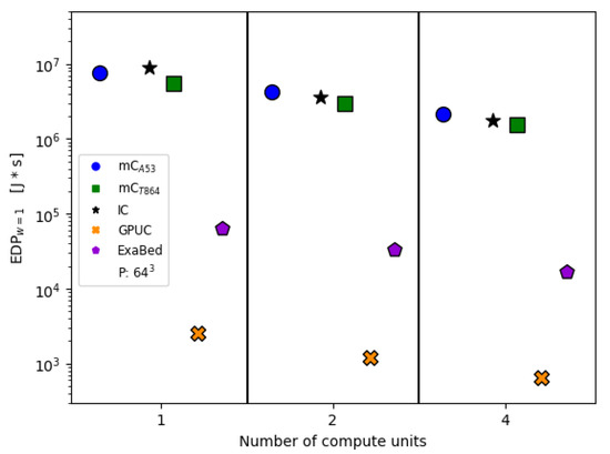 In Figure 4, we present the results of the EDP for and particles. We note that with the same CUs, the GPUC has a better EDP than the other platforms. When comparing the ExaBed and IC for the same time-to-solution configuration, the ExaBed has a better EDP. The configuration with 1 CUs on ExaBed has the same time-to-solution of the configuration with 4 CUs of the IC (we compare the execution time of the ExaBed using one CU with the execution time of the IC using four CUs in Figure 3).