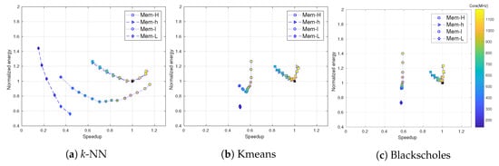 Speedup and normalized energy for three selected benchmarks and different frequency configurations. Toward the bottom (energy) and right-hand side (speedup) is best.