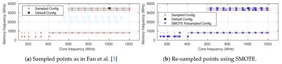 One way to handle the problem is to generate new samples in the minority class (mem-L), which is named oversampling and used widely in the machine learning to compensate for an imbalanced dataset. There are three popular techniques to oversample minority classes: (i) random sampling with replacement, (ii) the adaptive synthetic (ADASYN) sampling method and (iii) the synthetic minority oversampling technique (SMOTE) []. Figure 6b shows the oversampled points (blue circle) using the most common technique SMOTE. After oversampling, there are 14 points on the lowest memory frequency, and they are used in the training phase (see Figure 3b) to improve the prediction accuracy.