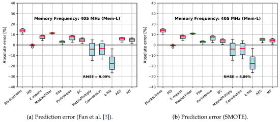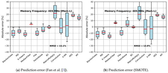 With respect to [], the use of SMOTE reduced the speedup prediction error for memory frequency 405 MHz (from 9.1% to 8.9%) and normalized energy prediction error for memory frequency 405 MHz (from 15.1% to 13.9%).
