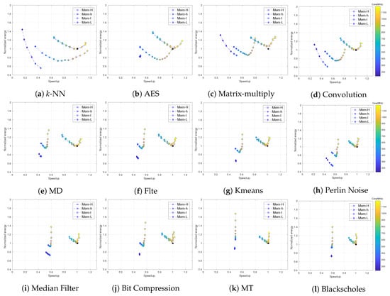 Speedup and normalized energy for twelve selected benchmarks and different frequency configurations as in Fan et al. []. Bottom (energy)-right (speedup) is better.
