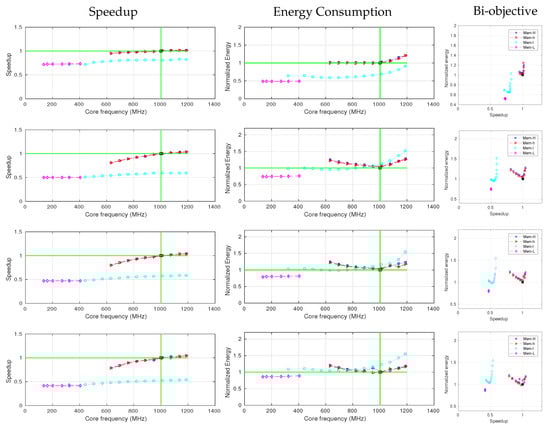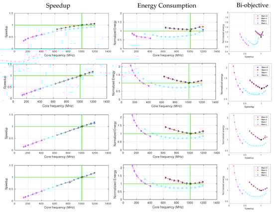 However, the speedup and normalized energy are slightly different between small and large input sizes. For the smaller problem size (the top in Figure 10), the rate of speedup increases with core frequency scaling and also the curvature of normalized energy are lower than the other three larger input sizes. While for the other three input sizes, the speedup and normalized energy consumption do not change a lot as the input size increases from 262144 to 1048576, respectively.