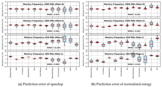 In Figure 12a, the speedup error analysis shows that the error is dependent on the memory frequency. The error for the highest memory frequencies is quite low. It is usually within the and goes over the only for few outliers. The error here is also evenly distributed (over and under approximations are similar). Figure 12b shows the normalized energy prediction error by memory frequency and program. High memory frequency predictions are accurate. However, the relatively small error for the two highest-frequency configurations is not evenly distributed as for speedup, and it is also application dependent. For instance, the AES code is always over-approximated.