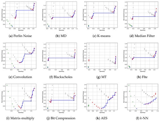Pareto frontier accuracyFigure 13 provides an overview of the Pareto set predicted by our method and the real ones, over a collection of twelve test benchmarks. The gray points represent the measured speedup and normalized energy of all the sampled frequency configurations (mem-H, mem-h and mem-l), except for mem-L, which are in green because they are not modeled with our predictive approach. The default configuration is marked with a black cross. The blue line represent the real Pareto front , while the red crosses represent our predicted Pareto set (we did not connect these points because they are not necessarily dominant each other).