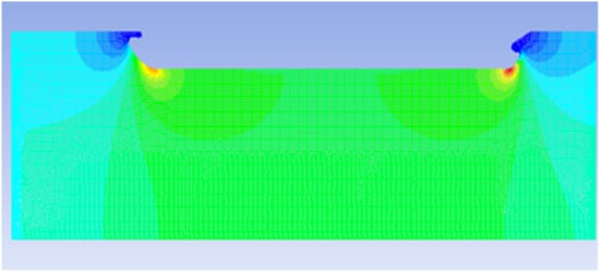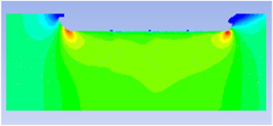Figure 7 shows the volume fractions of air and seawater in the flow-field. The bubbles (yellow color) create a protective mattress underneath the hull as the ship cruises. Air (red color) fills the three injectors and the flow distracts small pieces of air, creating small cavities or bubbles that are attached on the hull’s surface. In that way, the skin friction coefficient is abruptly decreased, leading to a reduction in fuel consumption and emissions, as is mentioned in Section 3.