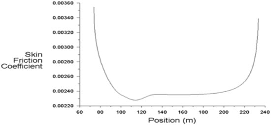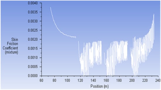 The respective skin friction coefficient for this analysis is presented in Figure 6. The graph tends to eliminate where the seawater faces air bubbles (Cf ≈ 0), and this causes fluctuation between 0 and 0.002. Finally, the coefficient Cf (0.0020) was selected to be the upper value.