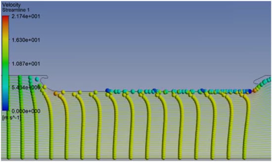 A streamline animation snapshot (Figure 8) explains the procedure, as the small air pieces (blue color) are mixed with the passing seawater flow (yellow color) at the air-lubricating areas. The flow proceeds from left to right, suggesting that the ship travels in the left direction of the flowing field.