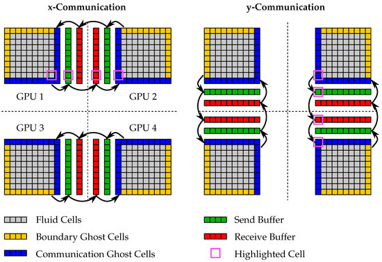 The communication procedure is shown in Figure 1. The flow state data of the exchanged cells is not continuous in memory. Therefore, as a first step, the flow state data of the sending cells is collected in a send buffer by a kernel. This send buffer is then sent to the neighboring process via Message Passing Interface (MPI) library calls. There, the data are received in a receive buffer and subsequently distributed to the communication ghost cells. These ghost cells are located at the same location as the corresponding send cells in the physical space of the simulation domain, but are directly outside the receiving sub-domain. Furthermore, the send and receive buffers must be downloaded and uploaded, respectively, because MPI can only access host memory. The host is the computer containing the GPGPU. Some modern MPI implementations feature CUDA support, where the network adapter can directly access GPGPU memory to improve communication performance. This procedure was implemented, but not used for the results in this work.