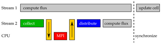 The flux computation on cell faces in the vicinity of the sub-domain boundaries depends on the received cells. In order to keep the code logically consistent, the set of cell faces is divided into two sub-sets. The first contains all cell faces that were independent of the communication and the second faces that depend on the communication. The second set can only be processed after the communication is complete. Communication hiding is implemented in terms of CUDA streams. CUDA streams are independent queues, where each queue processes its tasks sequentially. One stream is used for the evaluation of the first sub-set of cell faces; see Stream 1 in Figure 2. This kernel is invoked first. The second stream handles all communication and interacts with the CPU; see Stream 2 in Figure 2. It finally computes the fluxes of the second sub-set of cell faces. The independent execution of the two streams is synchronized after the flux computation, and finally, all cells are updated. Figure 2 accounts for a single time step with communication in only one direction.