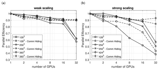 For weak scaling, the communication hiding was able to keep the parallel efficiency above for all tested problem sizes; see Figure 3a. Without communication hiding, the performance deteriorated at 32 GPGPUs, which was related to the hierarchical network topology in the HPC-system utilized for these benchmarks. The first 20 GPGPUs were connected to the same switch, while the remaining 12 GPGPUs were connected to another switch, such that the communication had to go an additional step. The good performance under weak scaling was due to the constant favorable ratio of computation per communication. For strong scaling, this ratio successively deteriorated, which can be seen in Figure 3b. For the larger problems, the communication hiding was able to keep the efficiency above . For the smallest problem size, parallel efficiency deteriorated also when communication hiding was utilized. This was due to the small number of cells () per GPGPU, such that the GPGPUs could not utilize their full potential due to reduced latency hiding.