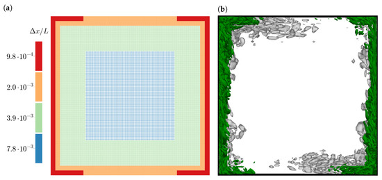 The flow domain for the present simulation was a cube with dimension and with periodic boundary conditions in the y-direction to resemble the larger extent of the experimental cavity. The flow domain was discretized by a non-uniform grid with four grid levels and refinement towards the walls; see Figure 4a. The background grid had a resolution of such that the third refinement level had a wall resolution of . This wall resolution was slightly coarser than the wall normal resolution in the reference simulation of Salinas-Vázquez et al. [72] where a stretched grid with at the wall was used. The grid was distributed to eight GPGPUs with a layout of subdomains.