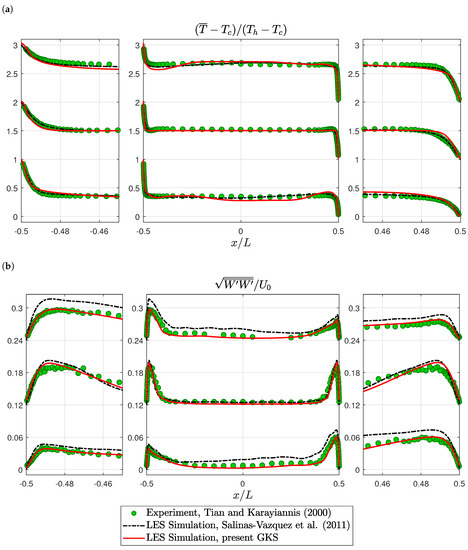 For a more detailed validation, time averaged velocity profiles are compared. Vertical velocity profiles matched the experimental data well; see Figure 5a. The GKS slightly under-predicted the peak velocities on the top left and bottom right, while the reference simulation over-estimated these velocities. The horizontal velocities showed large discrepancies between all three datasets, such that no clear result could be gained; see Figure 5b. In the temperature profiles, the present GKS results showed deviations from the experimental data that were not present in the reference simulations; see Figure 6a. The GKS results were non-monotonic, i.e., they under-estimated temperature just outside the heated boundary layer and over-estimated temperature just outside the cooled boundary layer. Overall, the temperature field was captured well. The thermal boundary layer thicknesses were correctly estimated. Finally, the turbulence was measured as the root-mean-squared vertical velocity fluctuation. The reference simulation substantially over-estimated the turbulence on top left and bottom right, while the GKS essentially correctly predicted the strength and profile of the turbulence; see Figure 6b. This finding is consistent with the discrepancy in turbulent structures, observed in Figure 4b. It supports the interpretation that the present GKS results resembled the experiment better in that region than the reference simulation.