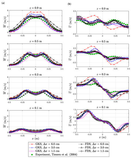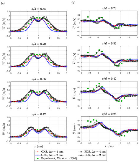 The axial velocities of both simulations show a reasonable agreement to the experimental data for both FDS and GKS; see Figure 7a. FDS tended to over-estimate the plume width, while GKS tended to underpredict the width, especially at higher resolution. Both simulations featured a velocity drop in the center of the flame that was not present in the experimental data. In terms of maximal velocity magnitude, FDS tended to over-estimate and GKS to under-estimate. The radial velocity profiles of both simulations showed the measured flow from the inside to the outside; see Figure 7b. The experimental data featured a strong peak in radial velocity at about cm. The strength of this peak was only captured by the coarse FDS simulation. Both the fine grid FDS and GKS simulation did not show such a strong peak.