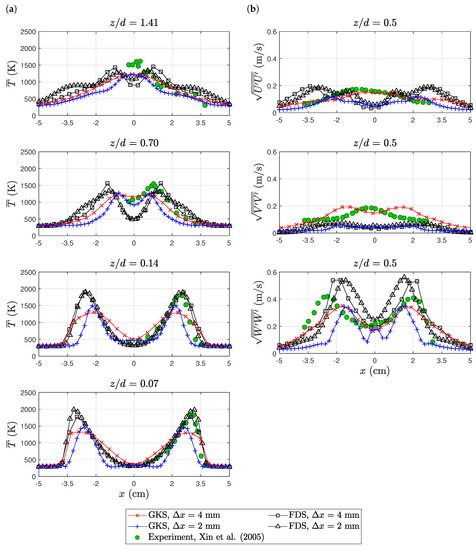 The experimental temperature profiles are only reported for the positive x-axis. The absolute temperature magnitude was under-predicted by GKS, while FDS obtained a good agreement; see Figure 8a. In accordance with the axial velocity profiles, the fine GKS simulation under-predicted the flame width. FDS on the other hand captured nearly the correct flame width with a slight tendency to over-predict. The magnitude of the root-mean-squared vertical (axial) velocity fluctuations was captured with acceptable accuracy; see Figure 8b. The shape of the profiles deviated substantially from the experiment for all simulations. GKS showed less turbulence than FDS.