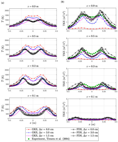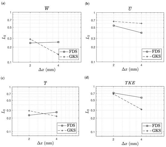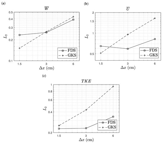 where the simulations results are interpolated linearly towards the location of the experimental data. The sums therein were computed over all grid points on all heights. The deviations for velocities, temperature, and turbulent kinetic energy are shown in Figure 9. A prevalent accuracy between the two methods cannot be found. Furthermore, no substantial improvement in accuracy with refinement was observed for the two simulation methods. In this metric, the GKS results even deviated more from the experimental data with refinement. Nevertheless, the overall accuracy of both methods is comparable. Hence, these results show the general applicability of GKS for the simulation of fire, while some deficiencies in predicting the maximal flame temperature with respect to FDS were observed.