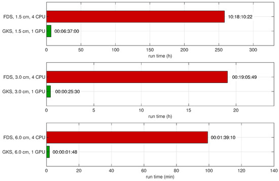 Finally, we compared the absolute times to the solution for both FDS and GKS; see Figure 10. FDS was run on a single CPU core, four cores, and twenty cores. All cores were in the same computer node, which was equipped with two ten-core INTEL Xeon E5-2640v4 CPUs. While using four cores brought a substantial speedup, using more cores brought no further improvement in this experiment. GKS was run on a single NVIDIA Tesla P100 GPGPU. While FDS required between several hours and multiple days to compute twenty seconds of real-time in the simulation, GKS terminated in about half an hour on the coarse grid and nine and a half hours for the fine grid. This resulted in a speedup of about 24 for the coarse and 16 for the fine simulation, demonstrating the capabilities of massively parallel implementations on GPGPUs. While one could argue that the FLOPS rate of the used CPU was substantially lower than of the GPGPU and one should rescale the corresponding wall-clock times accordingly, we note that the inherent FDS solvers cannot utilize the GPGPU architecture, and thus, the GKS has the advantage to benefit from this many-core architecture. In addition, the scalability of the GKS on massively parallel CPU-hardware bears no special challenges, but was not addressed in this work.