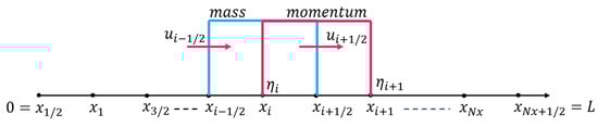 2) and approximate them using the numerical equations below, which are based on the finite volume method on a staggered grid: