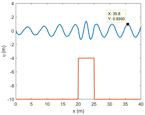 Here, we simulate the wave propagation over a rectangular breakwater using the numerical scheme of Equations (