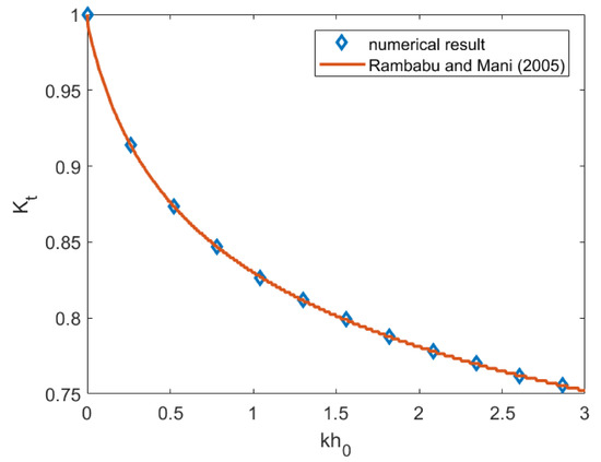 In this subsection, we will compare the values of from our numerical simulations with the data collected from experiments involving physical models of submerged breakwaters. It is hoped that the error calculated from comparing these results will be small, so that we can use this numerical model to emulate the physical phenomenon of scattering waves due to the existence of a breakwater structure.