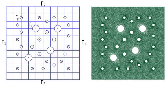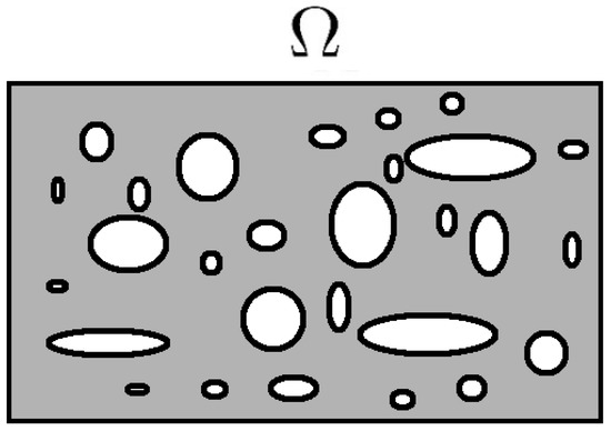 Let , be the flux and is the perforated domain (see Figure 1). We write Equation (2) in the mixed form