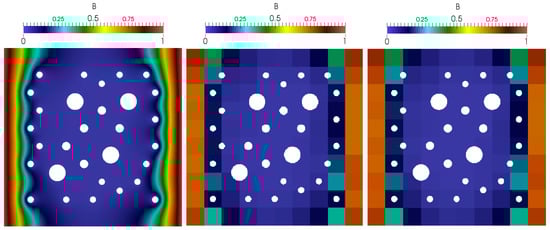 A computational perforated domain is presented in Figure 4 and has dimensions . For the approximation of the perforated domain, we use an unstructured fine grid with triangular cells that resolves perforations on the grid level. This can lead to the large discrete system of equations for the traditional finite element approximations. To reduce the size of the system, we present a multiscale solver that used to construct a reduced-order approximation on the coarse grid. The coarse grid can be either structured or unstructured. In this work, for simplicity, we consider a structured grid to illustrate the multiscale method. In many applications, it is easier to use structured coarse grids and resolve the subgrid effects as we do in our simulations. We construct an unstructured fine mesh that contains 61,912 cells, 93,668 facets and 31,727 vertices. The coarse grid is uniform, which contains 100 cells, 220 facets and 121 vertices. We set , , and .
